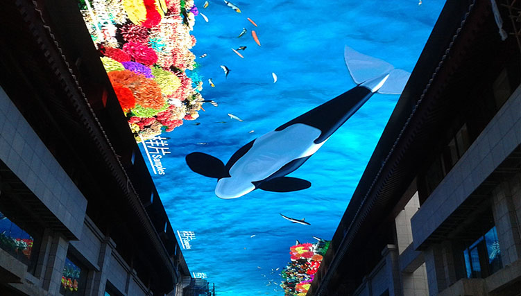 ● 4月,联建光电打造的秦汉唐国际文化商业广场3000平方米LED穹顶天幕,它是迄今为止全球点数最多的超大室内LED显示屏之一。