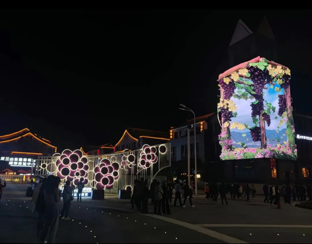 另一块裸眼3D大屏位于葡萄酒文化广场,作为凤凰幻城的对外展示面,很好地起到引客导流的作用。屏幕上正在播放的葡萄酒相关裸眼3D视频,与广场葡萄酒特色展示的功能相结合,沉浸式的观看体验,成为广场一大亮点。