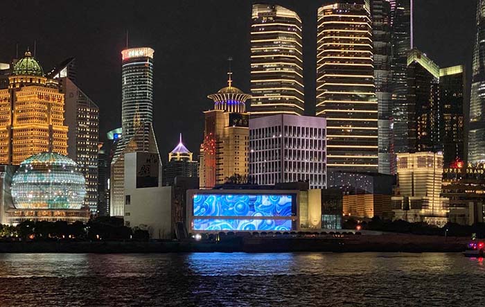 该项目位于上海浦东美术馆,是浦东新区重大文化工程项目,地处陆家嘴中心地带,紧邻东方明珠塔、国际会议中心,被誉为身处“诗歌级的地理位置”。此外,该美术馆由法国著名建筑师让·努维尔设计,他从杜尚的作品《大玻璃》当中得到灵感,美术馆面向黄浦江的外立面由两块深5米、宽55米、高度分别为12和6米的“大玻璃”组成。而联建光电为美术馆打造的P3小间距户外第一巨幕紧贴“大玻璃”后方,总面积800㎡,总像素近8600万,整屏分辨率远超10K标准,成为世界艺术杰作的绝美展示“窗口”,而平日屏幕不点亮的时候,“大玻璃”通过物理反射可将上海滩对岸的特色建筑在玻璃墙中呈现,美术馆外游客可随时间推移欣赏到不一样的外滩的景观。