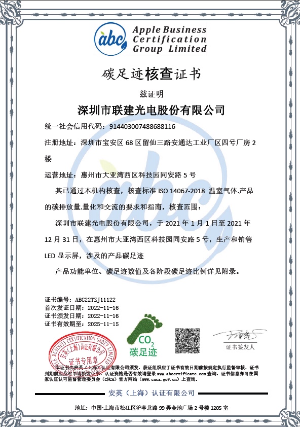 目前,联建光电已经积极响应国家“双碳”环保的发展战略,是业内少数开启绿色供应链认证的企业,不仅有绿色供应链体系认证证书,还获得了温室气体核查认证证书、碳中和承诺示范单位、碳足迹核查证书等多种绿色认证证书,联建光电打造的绿色供应链体系,不仅是保护环境,也是企业社会责任感的体现。增强企业的竞争力提高整个供应链的效益的同时,也可规避绿色技术贸易壁垒,保证产品的出口优势。