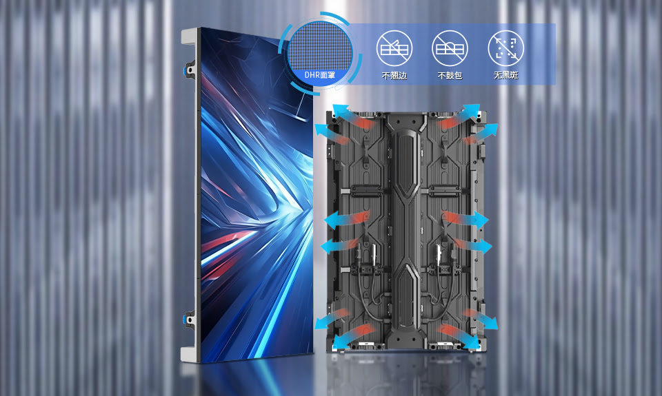 针对户外小间距(P2.6/2.9),采用DHR高温抗形变面罩,解决户外小间距产品面罩易翘边、易鼓包、侧面观看有黑斑等问题,解决视觉干扰